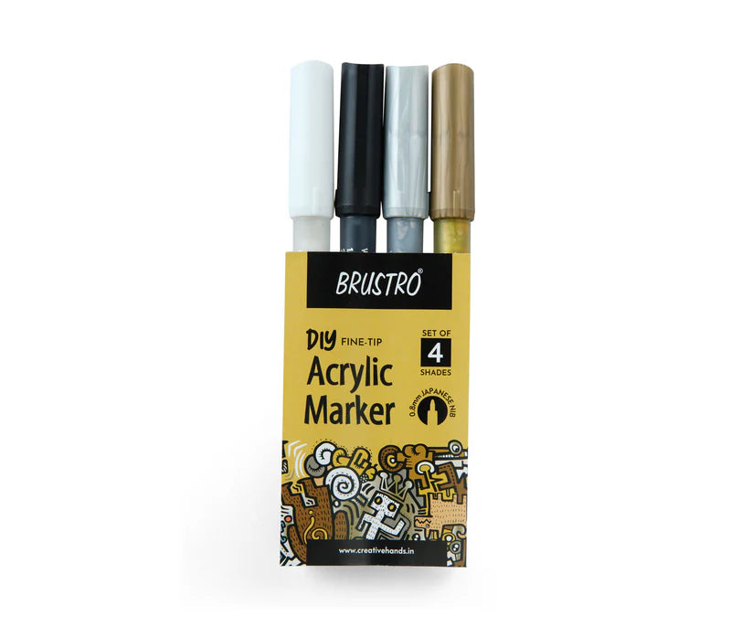 Brustro Acrylic (DIY) Fine Tip Marker Set of 4 – Gold, Silver, Black, White 0.8MM