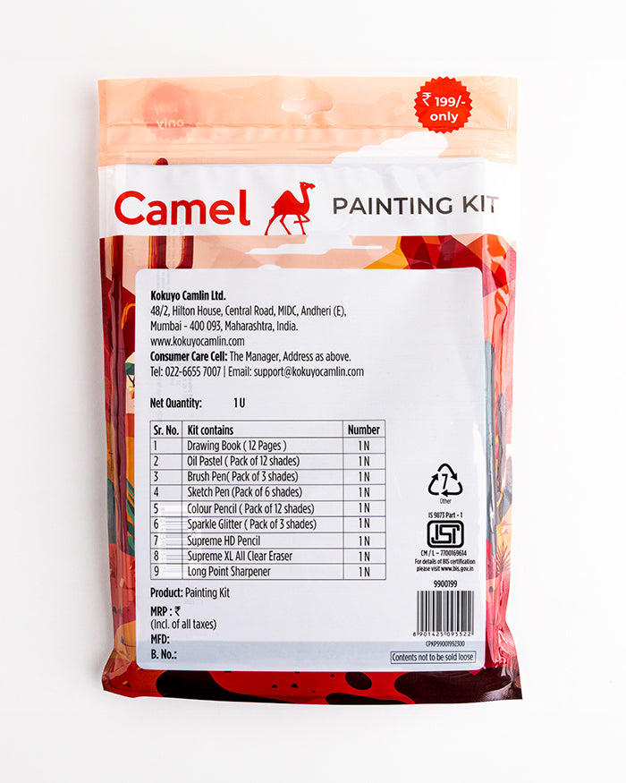 Drawing Book, Oil Pastel Pack of 12 shades, Brush Pen pack of 3 shades, Sketch Pen pack of 6 shades, Colour Pencil pack of 12 shades, Sparkle Glitter pack of 3 shades, Supreme HD Pencil, Supreme XL All Clear Eraser, Long Point Sharpener